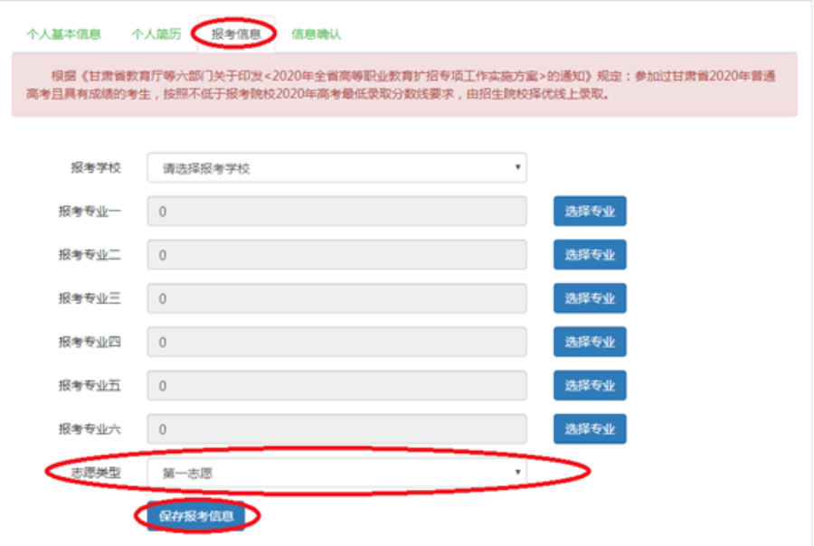 11.第三步,填寫報考信息。請考生務(wù)必注意,本次甘肅省高等職業(yè)教育擴招專項考試可以填報兩所院校志愿,請在“志愿類型”一欄中選擇所報志愿為第一志愿或是第二志愿。錄取過程中,先對所報第一志愿的院校進行錄取,如第一志愿院校未被錄取,再對第二志愿院校進行錄取。