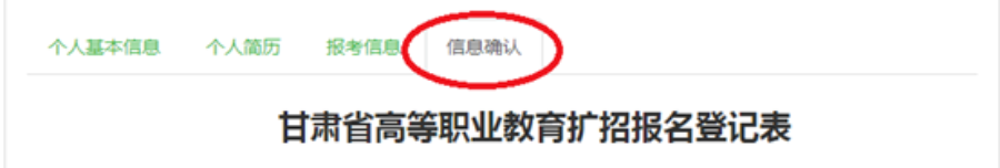 12.第四步,信息確認。考生請認真核對“甘肅省高等職業(yè)教育擴招報名登記表”中所生成的各項信息是否準確無誤,尤其是“報考院?!奔啊皩I(yè)”是否與本人填報的報考信息一致。如提交后需要修改,請點擊“取消提交個人信息,撤回”,再對需要修改的項目進行修改。