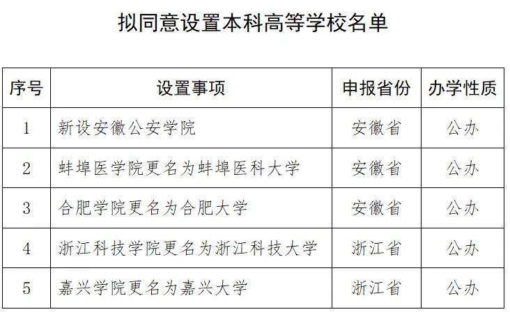 近日,教育部網(wǎng)站顯示,根據(jù)《中華人民共和國(guó)高等教育法》《普通高等學(xué)校設(shè)置暫行條例》《普通本科學(xué)校設(shè)置暫行規(guī)定》有關(guān)規(guī)定以及第八屆全國(guó)高等學(xué)校設(shè)置評(píng)議委員會(huì)考察評(píng)議結(jié)果,經(jīng)教育部黨組會(huì)議審議,擬同意新設(shè)安徽公安學(xué)院、蚌埠醫(yī)學(xué)院更名為蚌埠醫(yī)科大學(xué)、合肥學(xué)院更名為合肥大學(xué)、浙江科技學(xué)院更名為浙江科技大學(xué)、嘉興學(xué)院更名為嘉興大學(xué)。