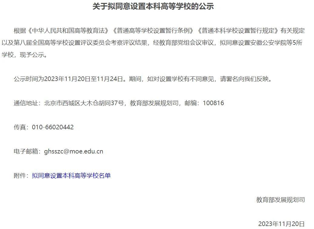 根據(jù)《中華人民共和國(guó)高等教育法》《普通高等學(xué)校設(shè)置暫行條例》《普通本科學(xué)校設(shè)置暫行規(guī)定》有關(guān)規(guī)定以及第八屆全國(guó)高等學(xué)校設(shè)置評(píng)議委員會(huì)考察評(píng)議結(jié)果,經(jīng)教育部黨組會(huì)議審議,擬同意設(shè)置安徽公安學(xué)院等5所學(xué)校,現(xiàn)予公示。