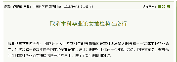 近日,北京大學(xué)教育學(xué)院/教育經(jīng)濟(jì)研究所研究員盧曉東在《中國科學(xué)報》發(fā)布文章表示,“本科生畢業(yè)論文不應(yīng)是必修課”,“要讓本科生論文回歸其‘選修課’的原本屬性,取消本科畢業(yè)論文抽檢工作勢在必行”。