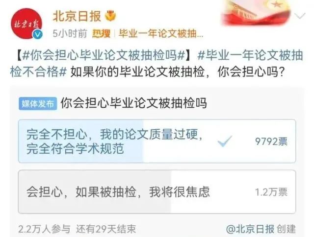此前,在北京日報創(chuàng)建的關(guān)于“你會擔(dān)心畢業(yè)論文被抽檢”投票中,超過半數(shù)網(wǎng)友選擇“會擔(dān)心,如果被抽檢,我將很焦慮”。還有不少網(wǎng)友表示:“我畢業(yè)五年了,還會被抽到嗎”、“為什么我已經(jīng)畢業(yè)了還不放過我”。