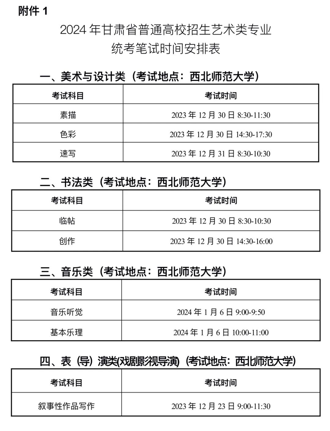 1.2024年甘肅省普通高校招生藝術(shù)類專業(yè)統(tǒng)考筆試時(shí)間安排表
