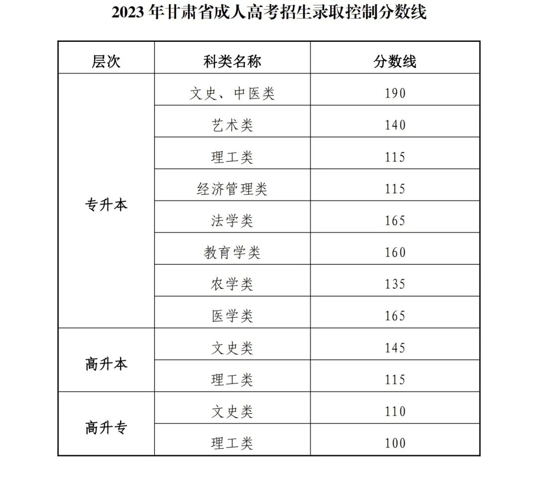 2023 年甘肅省成人高考招生錄取控制分數(shù)線