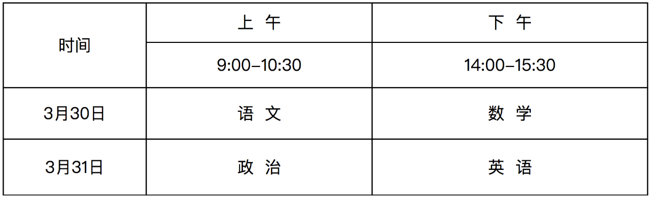 三、考試科目:語文、數學、政治、英語;考試分值:每科150分,總分600分,使用國家通用語言文字作答。
