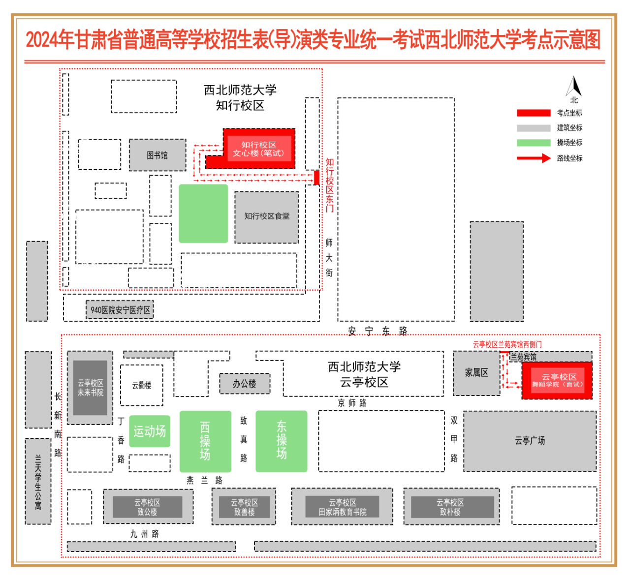面試考點設在西北師范大學云亭校區(qū)(甘肅省蘭州市安寧區(qū)安寧東路967號)舞蹈學院教學樓。