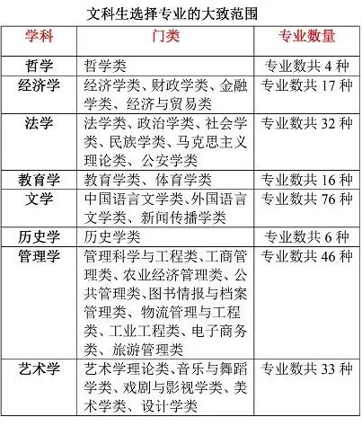 從整體上來看,文科生可選擇的專業(yè)主要集中在哲學(xué)、經(jīng)濟(jì)學(xué)、法學(xué)、教育學(xué)、文學(xué)、歷史學(xué)、管理學(xué)、藝術(shù)學(xué)等8個(gè)學(xué)科門類。