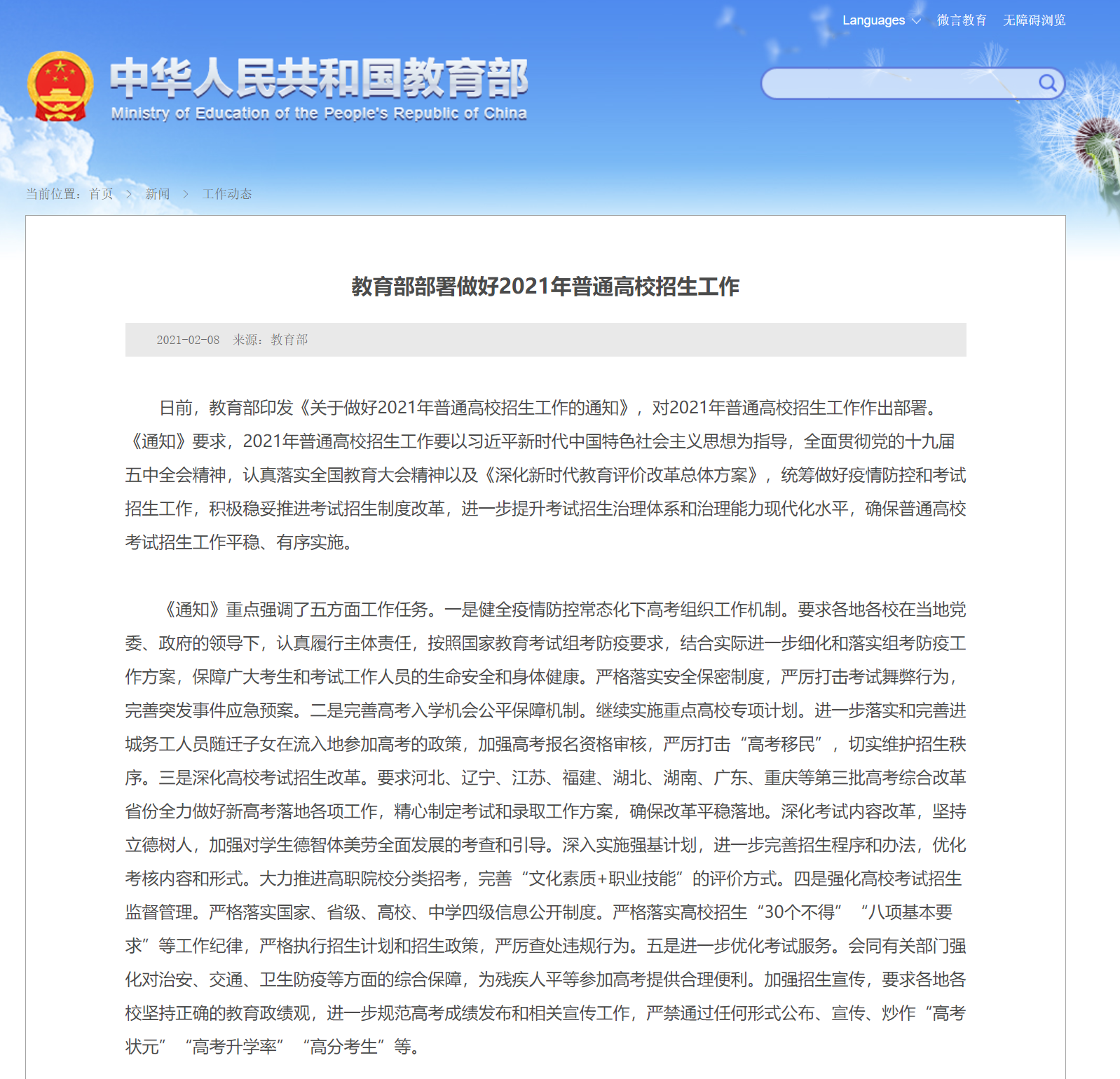 近日,教育部發(fā)布《關(guān)于做好2021年普通高校招生工作的通知》,要求積極穩(wěn)妥推進(jìn)考試招生制度改革,嚴(yán)禁通過任何形式公布、宣傳、炒作“高考狀元”“高考升學(xué)率”“高分考生”,深入實(shí)施強(qiáng)基計(jì)劃,進(jìn)一步完善招生程序和辦法,優(yōu)化考核內(nèi)容和形式。