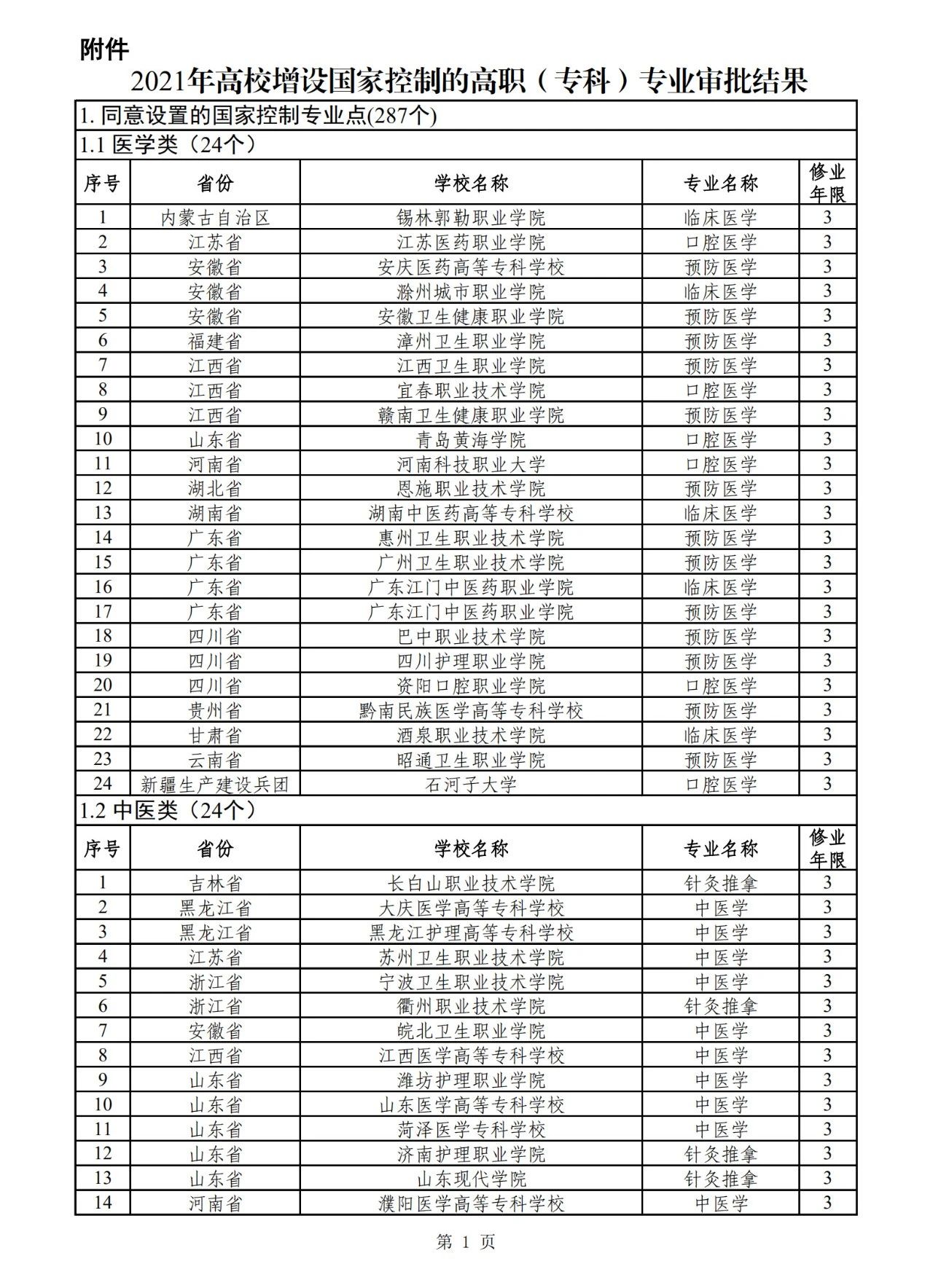 教育部關(guān)于公布2021年高校增設(shè)國家控制的高職(專科)專業(yè)審批結(jié)果的通知