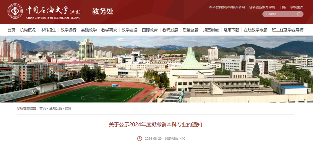 8月20日,中國石油大學(北京)教務處發(fā)布《關于公示2024年度擬撤銷本科專業(yè)的通知》,擬撤銷音樂學等9個本科專業(yè)。