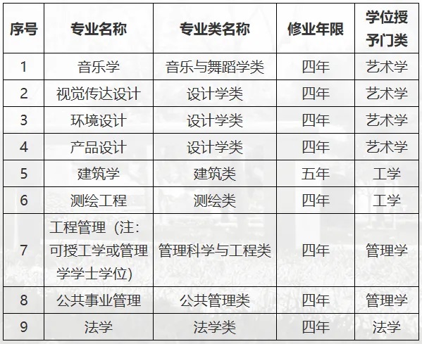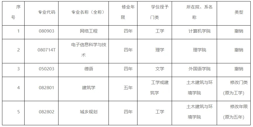 擬撤銷專業(yè):音樂(lè)學(xué)、表演、動(dòng)畫(huà)、保險(xiǎn)學(xué)、廣播電視學(xué)、信息管理與信息系統(tǒng)、公共事業(yè)管理、電子商務(wù)、應(yīng)用物理學(xué)、核物理、生物技術(shù)、材料物理、材料化學(xué)、金屬材料工程、無(wú)機(jī)非金屬材料工程、電子科學(xué)與技術(shù)、電子信息科學(xué)與技術(shù)、保密管理、工業(yè)設(shè)計(jì)、網(wǎng)絡(luò)工程、建筑環(huán)境與能源應(yīng)用工程、環(huán)境科學(xué)、城鄉(xiāng)規(guī)劃、工程造價(jià)、風(fēng)景園林、水利水電工程、水文與水資源工程、紡織工程、冶金工程、安全工程、信息安全