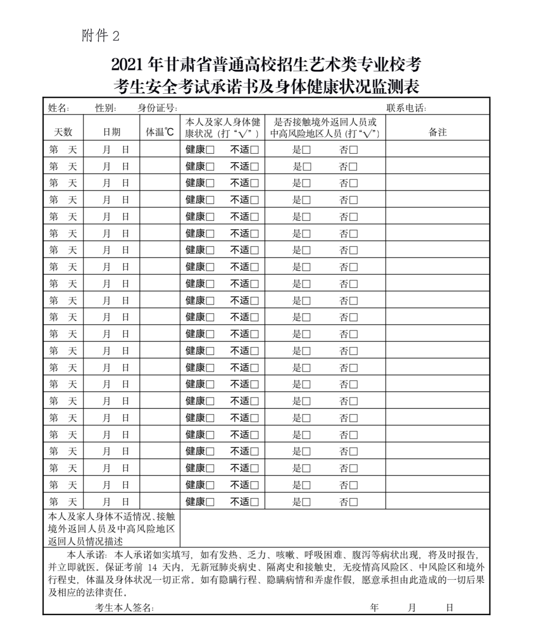 2. 2021年甘肅省普通高校招生藝術(shù)類專業(yè)??伎忌踩荚嚦兄Z書(shū)及身體健康狀況監(jiān)測(cè)表