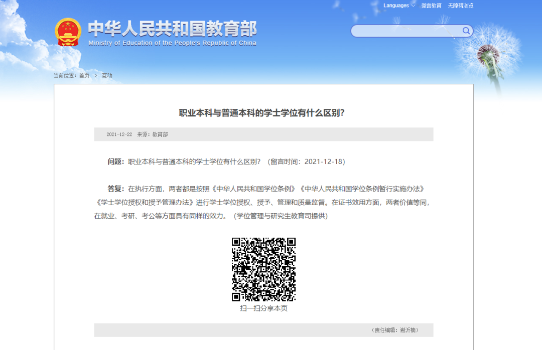問:職業(yè)本科與普通本科的學(xué)士學(xué)位有什么區(qū)別?(留言時間:2021-12-18)