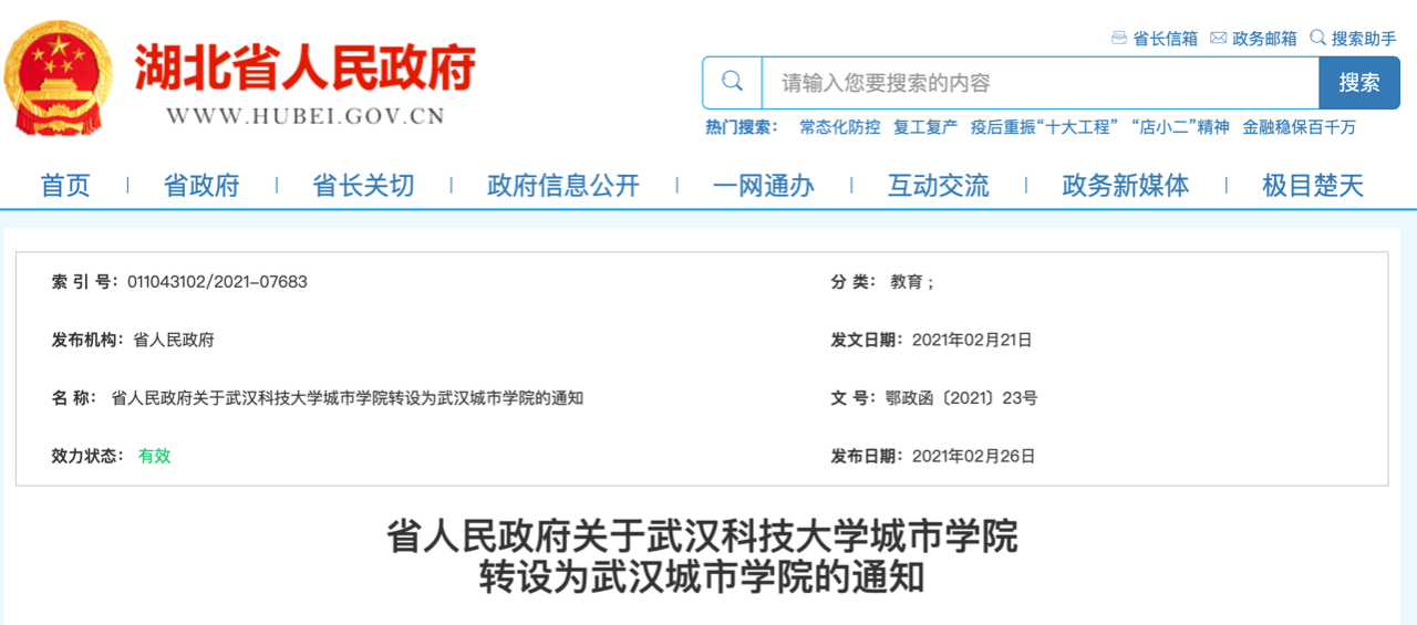 經(jīng)教育部批準(zhǔn),湖北省人民政府同意將武漢科技大學(xué)城市學(xué)院轉(zhuǎn)設(shè)為武漢城市學(xué)院,同時(shí)撤銷武漢科技大學(xué)城市學(xué)院的建制。且明確通知如下: