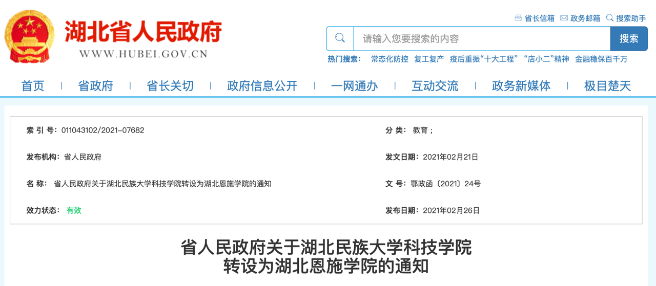 經(jīng)教育部批準(zhǔn),湖北省人民政府同意將湖北民族大學(xué)科技學(xué)院轉(zhuǎn)設(shè)為湖北恩施學(xué)院,同時(shí)撤銷湖北民族大學(xué)科技學(xué)院的建制?,F(xiàn)就有關(guān)事項(xiàng)通知如下: