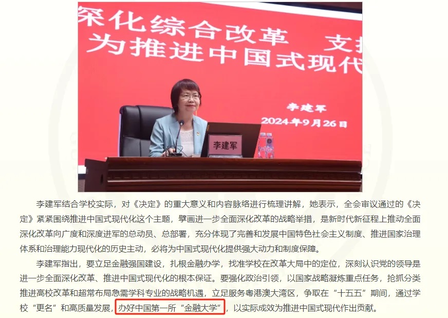 此前,2024年9月26日,廣東金融學院召開黨委理論學習中心組學習(擴大)會議,黨委書記李建軍在題為“深化綜合改革 支持全面創(chuàng)新 為推進中國式現(xiàn)代化作貢獻”的主題報告中指出,要立足金融強國建設,扎根金融辦學,找準學校在改革大局中的定位。爭取在“十五五”期間,通過學?!案焙透哔|量發(fā)展,辦好中國第一所“金融大學”,以實際成效為推進中國式現(xiàn)代作出貢獻。