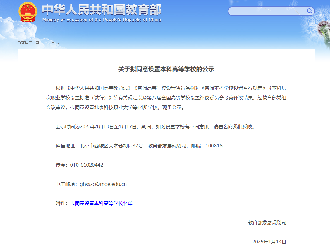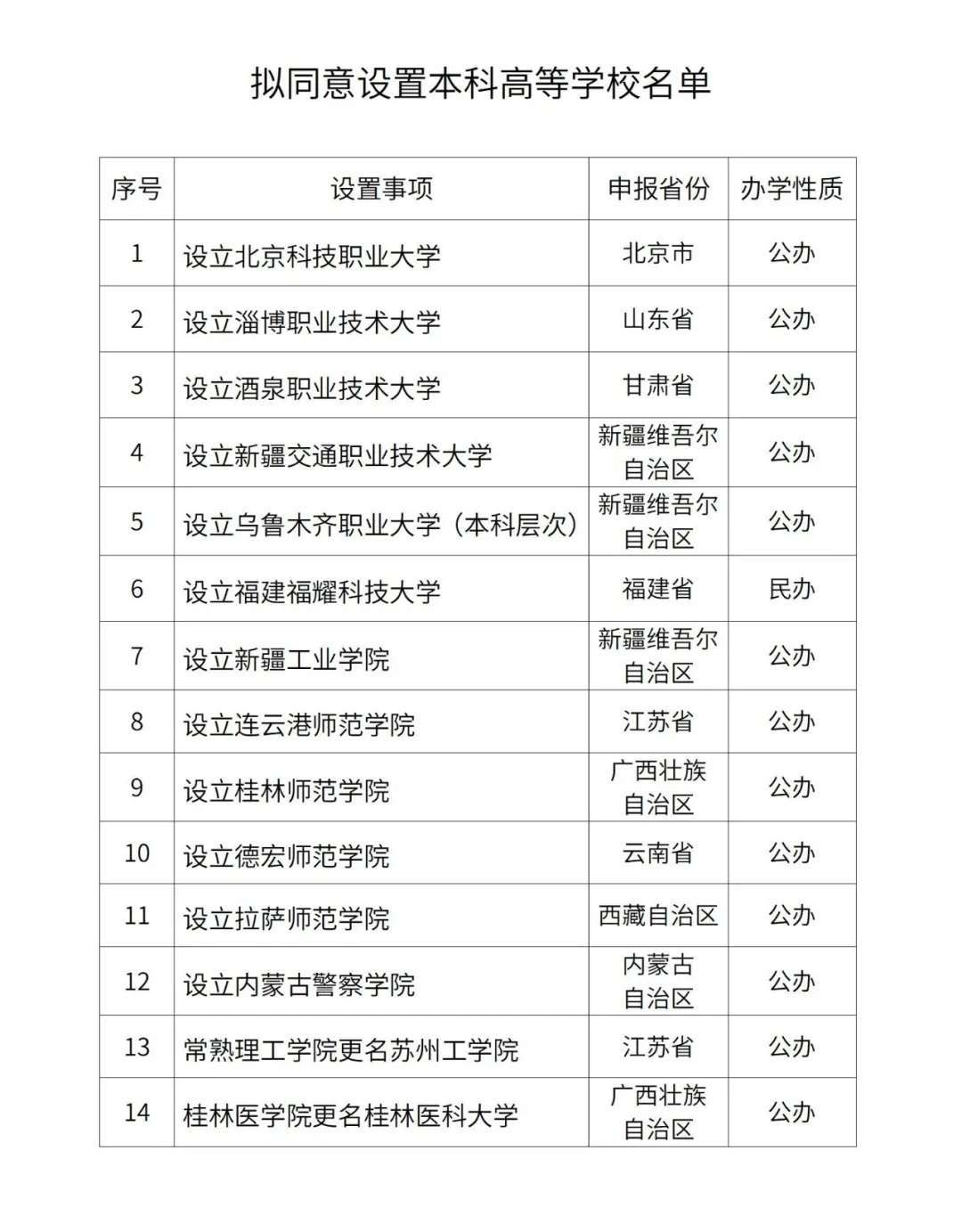 1月13日,教育部發(fā)布關(guān)于擬同意設(shè)置本科高等學(xué)校的公示。根據(jù)《中華人民共和國高等教育法》《普通高等學(xué)校設(shè)置暫行條例》《普通本科學(xué)校設(shè)置暫行規(guī)定》《本科層次職業(yè)學(xué)校設(shè)置標準(試行)》等有關(guān)規(guī)定以及第八屆全國高等學(xué)校設(shè)置評議委員會考察評議結(jié)果,經(jīng)教育部黨組會議審議,