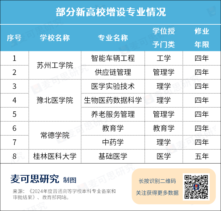 此外,對照教育部網(wǎng)站發(fā)布全國普通高等學(xué)校名單(截至2024年6月20日),我們注意到共有蘇州工學(xué)院、豫北醫(yī)學(xué)院、常德學(xué)院、桂林醫(yī)科大學(xué)等4所新高校,審批通過增設(shè)8個新專業(yè)。