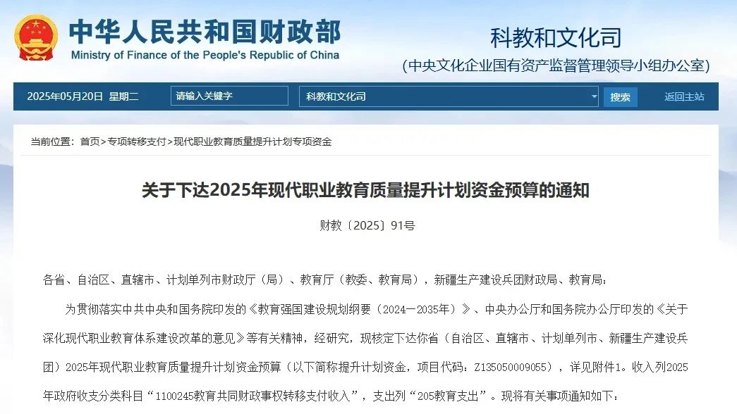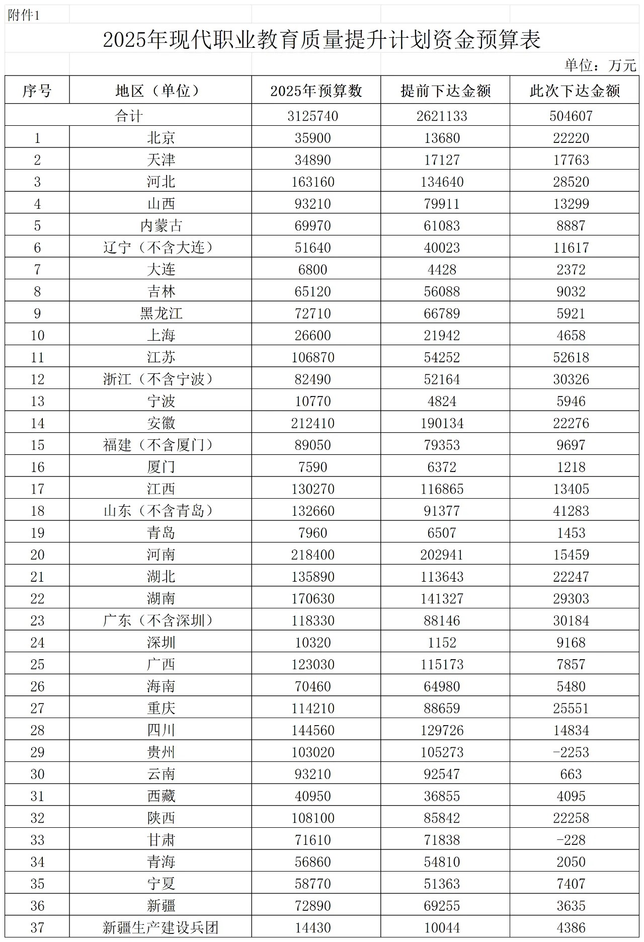 5月19日,財政部、教育部發(fā)布《關(guān)于下達2025年現(xiàn)代職業(yè)教育質(zhì)量提升計劃資金預(yù)算的通知》(下簡稱《通知》)。據(jù)《2025年現(xiàn)代職業(yè)教育質(zhì)量提升計劃資金預(yù)算表》顯示,2025年預(yù)算數(shù)合計312.57億元,提前下達金額262.11億元,此次下達金額50.46億元。