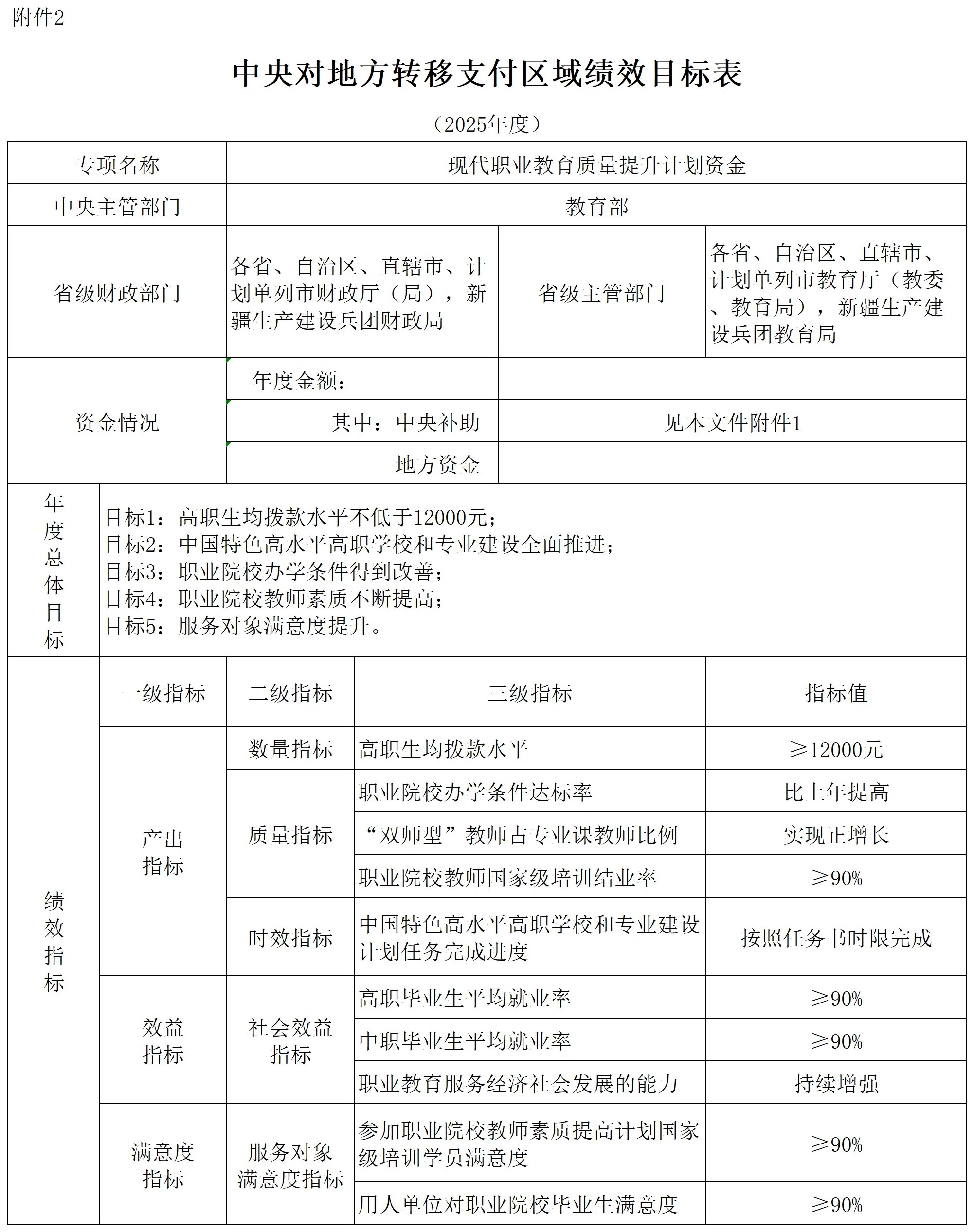 為貫徹落實中共中央和國務(wù)院印發(fā)的《教育強國建設(shè)規(guī)劃綱要(2024—2035年)》、中央辦公廳和國務(wù)院辦公廳印發(fā)的《關(guān)于深化現(xiàn)代職業(yè)教育體系建設(shè)改革的意見》等有關(guān)精神,經(jīng)研究,現(xiàn)核定下達你省(自治區(qū)、直轄市、計劃單列市、新疆生產(chǎn)建設(shè)兵團)2025年現(xiàn)代職業(yè)教育質(zhì)量提升計劃資金預(yù)算(以下簡稱提升計劃資金,項目代碼:Z135050009055),詳見附件1。收入列2025年政府收支分類科目“1100245教育共同財政事權(quán)轉(zhuǎn)移支付收入”,支出列“205教育支出”。現(xiàn)將有關(guān)事項通知如下: