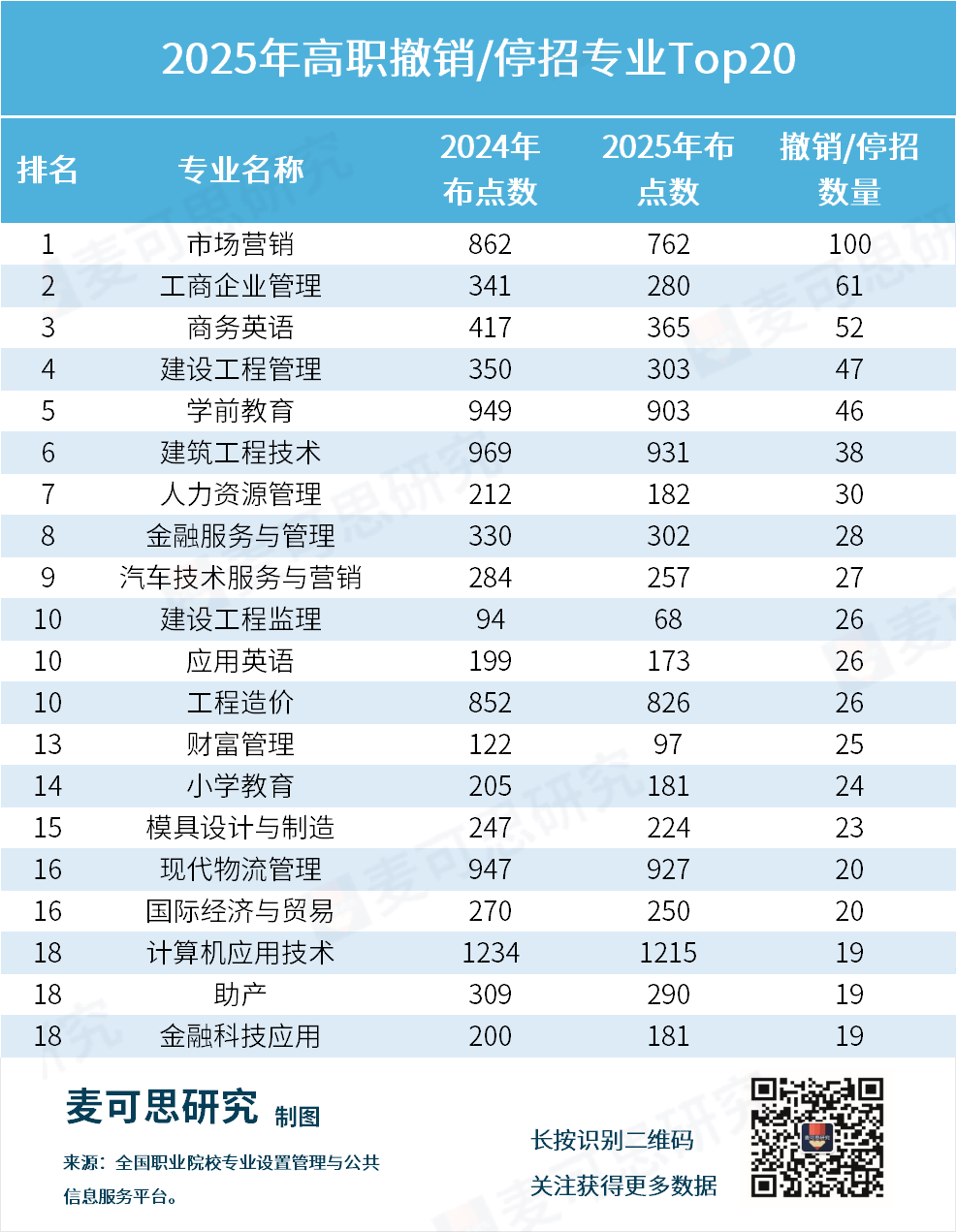 進(jìn)入2025年高職撤銷/停招專業(yè)榜前十的專業(yè)還有建設(shè)工程管理(減少47個(gè)專業(yè)點(diǎn))、學(xué)前教育(減少46個(gè)專業(yè)點(diǎn))、建筑工程技術(shù)(減少38個(gè)專業(yè)點(diǎn))、人力資源管理(減少30個(gè)專業(yè)點(diǎn))、金融服務(wù)與管理(減少28個(gè)專業(yè)點(diǎn))、汽車技術(shù)服務(wù)與營(yíng)銷(減少27個(gè)專業(yè)點(diǎn))、建設(shè)工程監(jiān)理(減少26個(gè)專業(yè)點(diǎn))、應(yīng)用英語(yǔ)(減少26個(gè)專業(yè)點(diǎn))、工程造價(jià)(減少26個(gè)專業(yè)點(diǎn))。