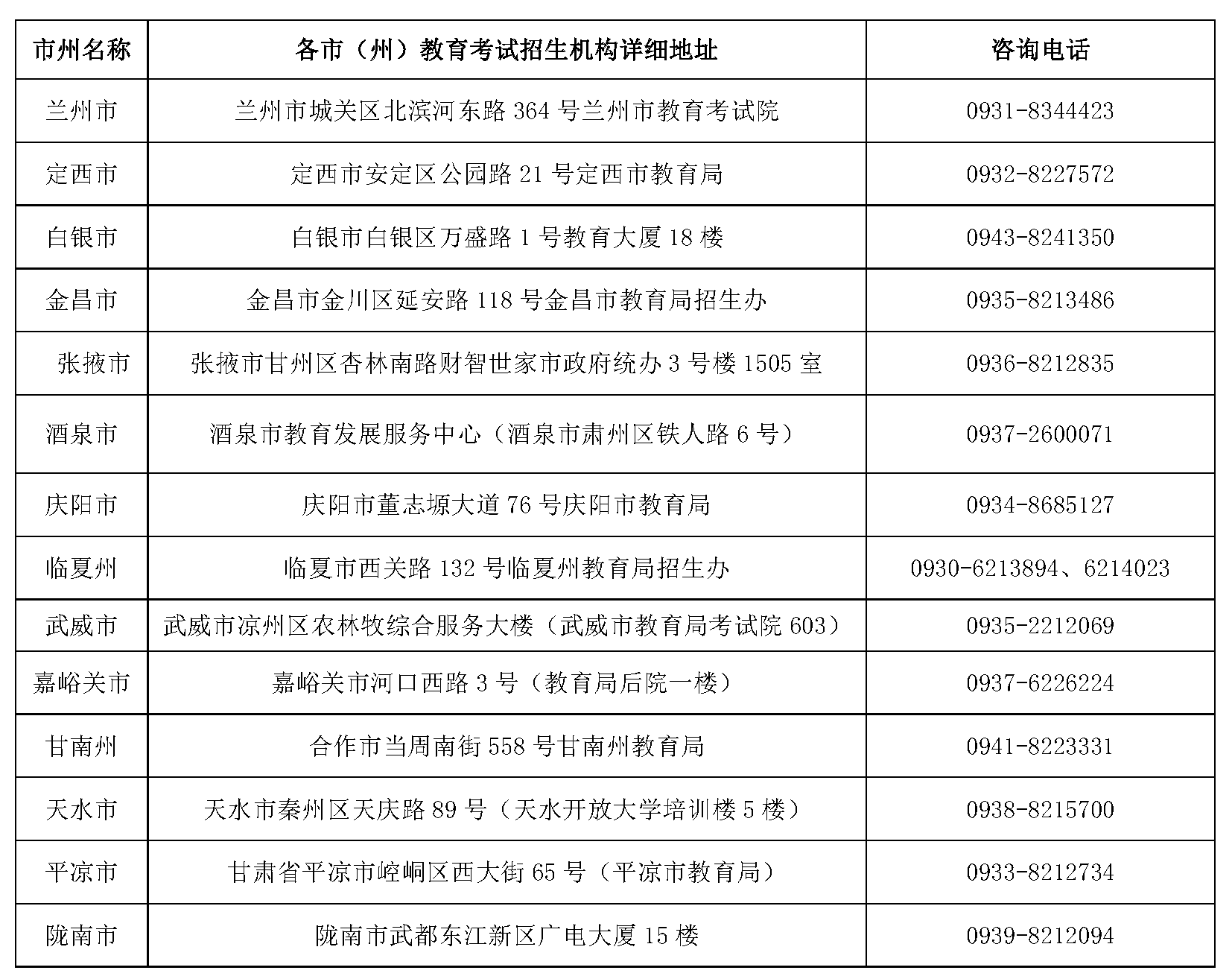 附:各市(州)教育考試招生機(jī)構(gòu)咨詢電話及詳細(xì)地址