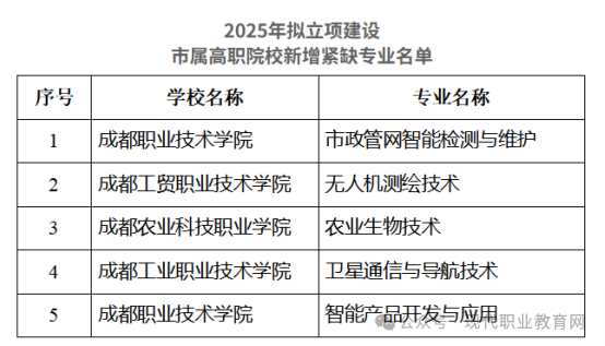 日前,成都市教育局發(fā)布《2025年市屬高職院校新增緊缺專業(yè)建設(shè)項目名單公示》,擬遴選建設(shè)5個市屬高職院校新增緊缺專業(yè),包括:市政管網(wǎng)智能檢測與維護、無人機測繪技術(shù)、農(nóng)業(yè)生物技術(shù)、衛(wèi)星通信與導(dǎo)航技術(shù)、智能產(chǎn)品開發(fā)與應(yīng)用。
