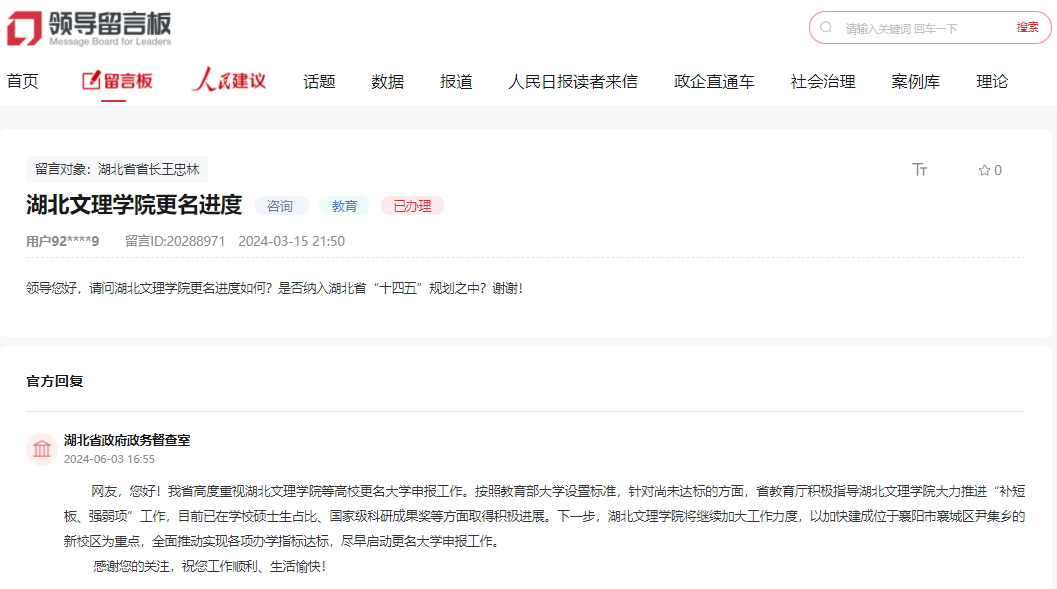 2024年3月,有網(wǎng)友通過人民網(wǎng)領(lǐng)導(dǎo)留言板咨詢“湖北文理學(xué)院更名大學(xué)的進(jìn)展”,湖北省政府政務(wù)督查室回復(fù)表示:“目前已在學(xué)校碩士生占比、國家級科研成果獎等方面取得積極進(jìn)展。下一步,湖北文理學(xué)院將繼續(xù)加大工作力度,以加快建成位于襄陽市襄城區(qū)尹集鄉(xiāng)的新校區(qū)為重點(diǎn),全面推動實(shí)現(xiàn)各項(xiàng)辦學(xué)指標(biāo)達(dá)標(biāo),盡早啟動更名大學(xué)申報(bào)工作?!?/span>