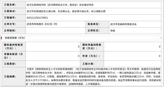 2025年2月,武漢公共資源交易平臺(tái)發(fā)布武漢信息網(wǎng)絡(luò)學(xué)院(武漢網(wǎng)絡(luò)安全大學(xué),暫定名)綜合建設(shè)項(xiàng)目招標(biāo)公告登記。