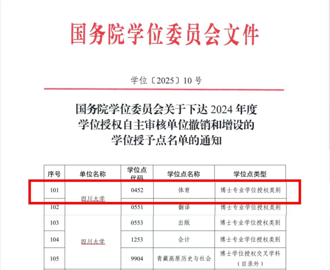 四川大學(xué)自主審核增設(shè)的體育、翻譯、出版、會(huì)計(jì)博士專業(yè)學(xué)位授予點(diǎn)正式獲得批準(zhǔn),同時(shí)獲批青藏高原歷史與社會(huì)博士學(xué)位授權(quán)交叉學(xué)科(目錄外)。