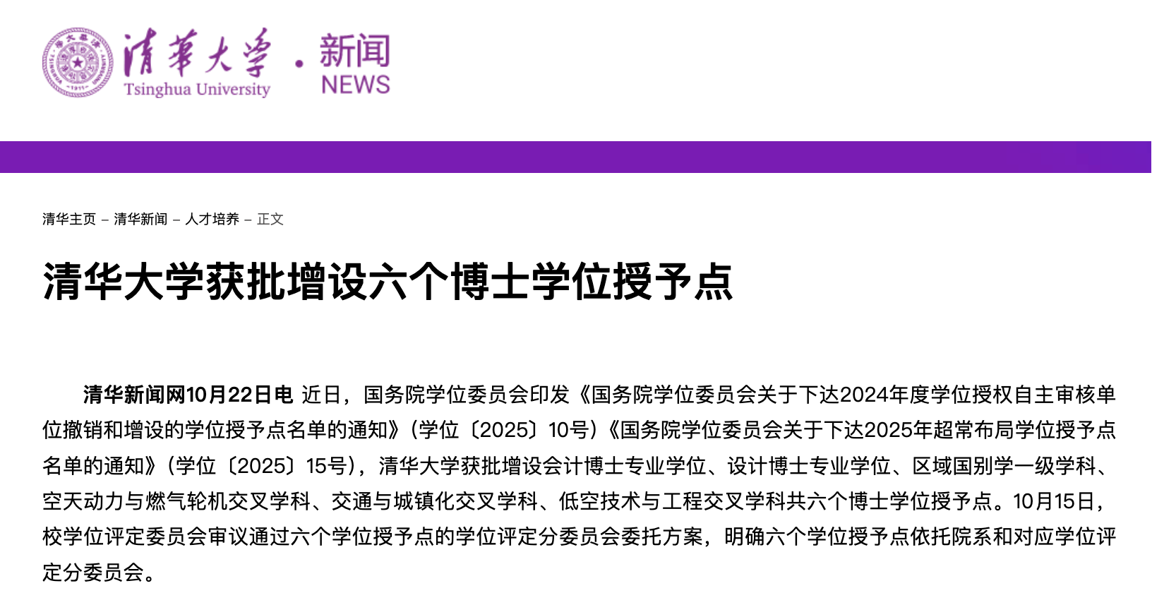 據(jù)清華大學(xué)新聞網(wǎng)消息,近日,國務(wù)院學(xué)位委員會印發(fā)《國務(wù)院學(xué)位委員會關(guān)于下達2024年度學(xué)位授權(quán)自主審核單位撤銷和增設(shè)的學(xué)位授予點名單的通知》(學(xué)位〔2025〕10號)《國務(wù)院學(xué)位委員會關(guān)于下達2025年超常布局學(xué)位授予點名單的通知》(學(xué)位〔2025〕15號),清華大學(xué)獲批增設(shè)會計博士專業(yè)學(xué)位、設(shè)計博士專業(yè)學(xué)位、區(qū)域國別學(xué)一級學(xué)科、空天動力與燃?xì)廨啓C交叉學(xué)科、交通與城鎮(zhèn)化交叉學(xué)科、低空技術(shù)與工程