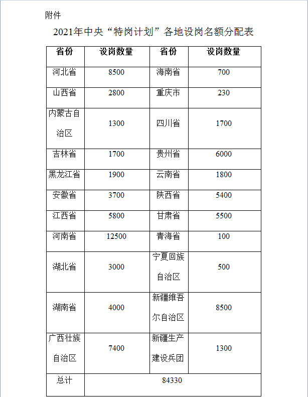 4月6日,教育部辦公廳、財(cái)政部辦公廳發(fā)布《2021年農(nóng)村義務(wù)教育階段學(xué)校教師特設(shè)崗位計(jì)劃實(shí)施工作的通知》(以下簡(jiǎn)稱“通知”),2021年全國(guó)計(jì)劃招聘特崗教師84330名,其中甘肅省特崗教師招聘5500人,比2020年增加100人。