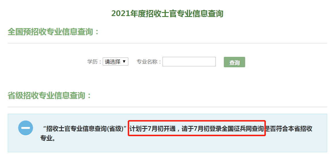 “招收士官專業(yè)信息查詢(省級)”計劃于7月初開通,請于7月初登錄全國征兵網(wǎng)查詢是否符合本省招收專業(yè)。