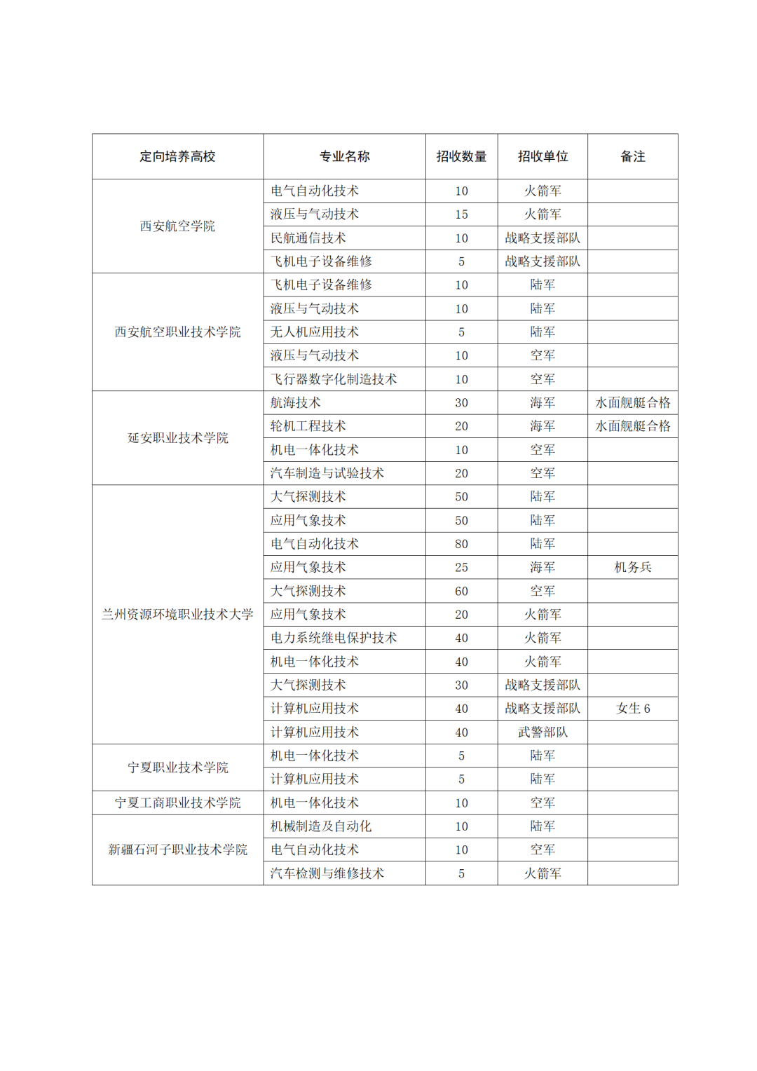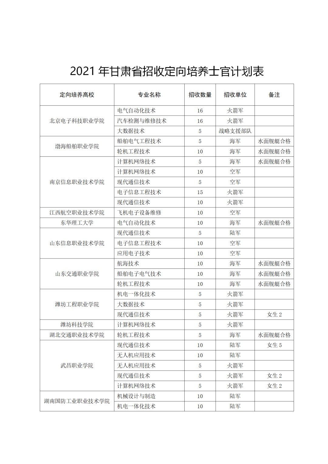 全國26所地方高職院校在我省招收定向培養(yǎng)士官1267人(含女士官17人)。我省2021年定向培養(yǎng)士官招生計劃已在《2021年甘肅省普通高等學(xué)校招生專業(yè)目錄》(上冊)中公布,并單獨(dú)編制直招士官生院校代碼,供考生填報志愿時使用。