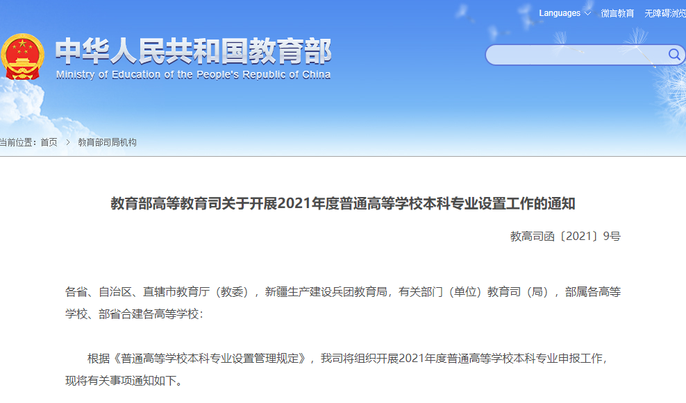 根據(jù)《普通高等學(xué)校本科專業(yè)設(shè)置管理規(guī)定》,我司將組織開展2021年度普通高等學(xué)校本科專業(yè)申報(bào)工作,現(xiàn)將有關(guān)事項(xiàng)通知如下。