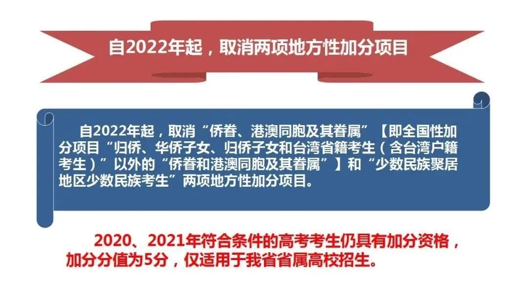 福建省本次高考加分政策調(diào)整主要有兩方面:(一)歸僑、華僑子女、歸僑子女考生和臺灣省籍考生(含臺灣戶籍考生),加分分值從2021年起從10分調(diào)整為5分,可面向所有高校投檔時使用。(二)少數(shù)民族考生,加分分值從2021年起從10分調(diào)整為5分,加分對象調(diào)整為全省19個民族鄉(xiāng)的少數(shù)民族考生,以及高山(享受高山補貼)和無橋梁、海堤與大陸相連的海島等少數(shù)民族考生。其中2021年至2023年,少數(shù)民族考生加分可面向所有高校投檔時使用;2024年至2025年,少數(shù)民族考生加分僅面向省屬高校投檔時使用。除福建外,多地已經(jīng)宣布取消少數(shù)民族考生加分政策。2020年9月,安徽發(fā)布高考加分政策調(diào)整:自2022年起,取消兩項地方性加分項目,其中便包括取消少數(shù)民族考生加分政策。1、僑眷、港澳同胞及其眷屬,即全國性加分項目“歸僑、華僑子女、歸僑子女和臺灣省籍考生(含臺灣戶籍考生)”以外的“僑眷和港澳同胞及其眷屬”。2、少數(shù)民族聚居地區(qū)少數(shù)民族考生。2020、2021年符合兩項地方性加分項目條件的高考考生仍具有加分資格,加分分值為5分,僅適用于安徽省省屬高校招生。2019年12月17日,江西省印發(fā)《江西省關于進一步深化高考加分改革的實施方案》,其中規(guī)定,對經(jīng)省政府批準的民族鄉(xiāng)(貴溪市樟坪畬族鄉(xiāng)等8個民族鄉(xiāng))和按法定程序批準且經(jīng)省有關部門向社會公示的民族村(鉛山縣陳坊鄉(xiāng)長壽畬族村等82個民族村),少數(shù)民族考生加分政策實行3年過渡期,即2020-2022年過渡期內(nèi)加5分不變,自2023年開始不再加分。2020年1月,遼寧省教育廳等五部門聯(lián)合發(fā)布《遼寧省進一步深化高考加分改革實施方案》(簡稱《實施方案》),也對高考加分政策進行了調(diào)整。在少數(shù)民族考生加分項目方面,喀左、阜新、新賓、清原、鳳城、岫巖、寬甸、北鎮(zhèn)、本溪、桓仁縣的少數(shù)民族考生,從2023年高考起,在考生統(tǒng)考成績總分的基礎上增加4分投檔,由高校審查決定是否錄取。從2026年高考起,取消該項高考加分政策。天津市則將對少數(shù)民族考生的加分照顧調(diào)整為優(yōu)先錄取。據(jù)天津市教育招生考試院消息,自2023年高考起,“少數(shù)民族考生報考天津市屬高校時增加5分投檔”的政策調(diào)整為“在本市所屬高校錄取時,少數(shù)民族考生在與漢族考生同等條件下,優(yōu)先錄取?!?br>