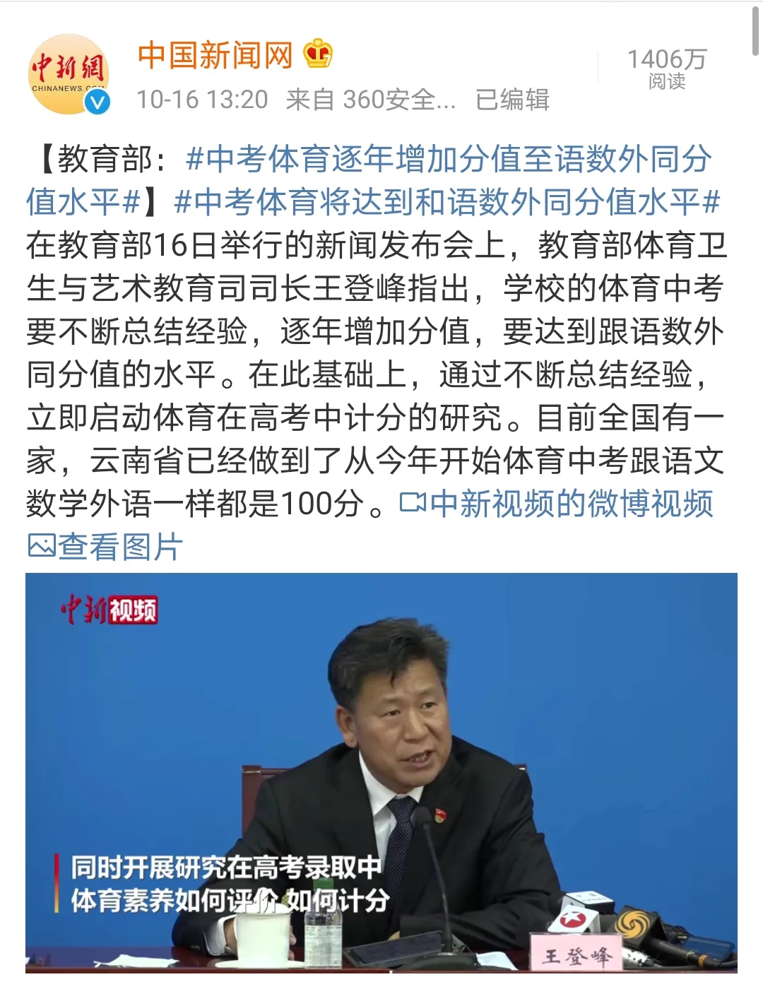 10月13日,中共中央、國務院印發(fā)了《深化新時代教育評價改革總體方案》以下是幾個方案要點:改進中考體育測試內(nèi)容、方式和計分辦法,形成激勵學生加強體育鍛煉的有效機制。把中小學生學習音樂、美術(shù)、書法等藝術(shù)類課程以及參與學校組織的藝術(shù)實踐活動情況納入學業(yè)要求;探索將藝術(shù)類科目納入中考改革試點。穩(wěn)步推進中高考改革,構(gòu)建引導學生德智體美勞全面發(fā)展的考試內(nèi)容體系,改變相對固化的試題形式,增強試題開放性,減少死記硬背和“機械刷題”現(xiàn)象。加快完善初、高中學生綜合素質(zhì)檔案建設和使用辦法,逐步轉(zhuǎn)變簡單以考試成績?yōu)槲ㄒ粯藴实恼猩J健?/section>10月16日,教育部召開新聞發(fā)布會,此次發(fā)布會中教育部重點強調(diào)了兩件事情:1. 學校的體育中考要逐年增加分值,達到跟語數(shù)外同分值的水平。2. 2022年,要全面實行美育(美術(shù)、體育)中考。美育課程以藝術(shù)課程為主體,主要包括音樂、美術(shù)、書法、舞蹈、戲劇、戲曲、影視等課程。