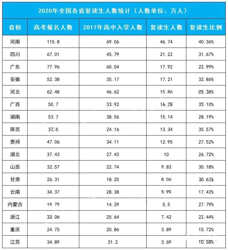 此前各省公布了復(fù)讀生人數(shù),從整理出來的表格數(shù)據(jù)可以看出,河南作為高考大省,其高考報名人數(shù)和復(fù)讀生人數(shù)均遙遙領(lǐng)先于其他省份,復(fù)讀生人數(shù)為46.74萬,復(fù)讀生比例達(dá)到了40.36%,可見整個河南省2021年高考的競爭將會空前激烈。