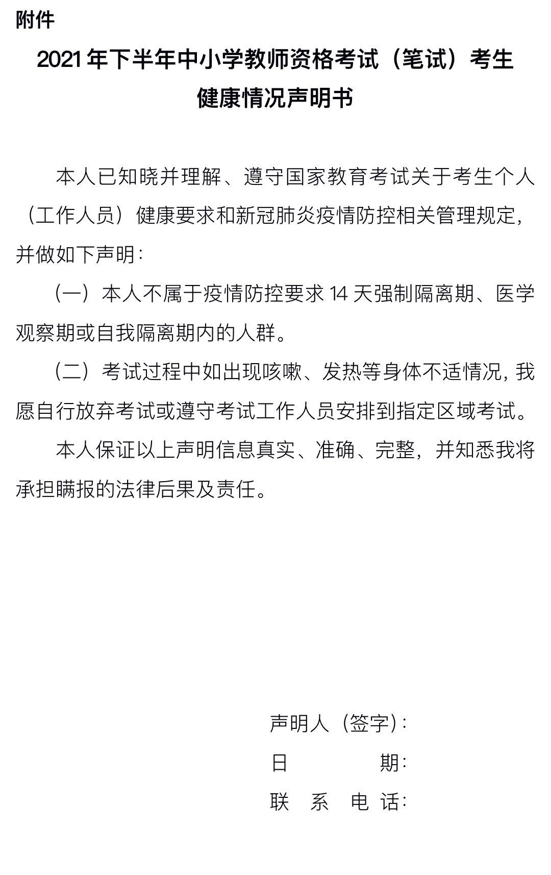 1.防疫須知:考生須自備口罩前往考點(diǎn),自覺接受體溫檢測,并提交有效期內(nèi)“甘肅省健康出行碼”截圖A4紙打印件和《2021年下半年中小學(xué)教師資格考試(筆試)考生健康情況聲明書》(須本人簽字,如報考多個科目,只需參加首場考試時提交即可),考前14天內(nèi)有中、高風(fēng)險地區(qū)旅居史和“甘肅省健康出行碼”為“非綠碼”的考生,還須提交考前48小時內(nèi)有效新冠病毒核酸檢測陰性報告原件,方可進(jìn)入考點(diǎn)參加考試,如無法提供相關(guān)健康證明的考生將嚴(yán)禁入場考試。