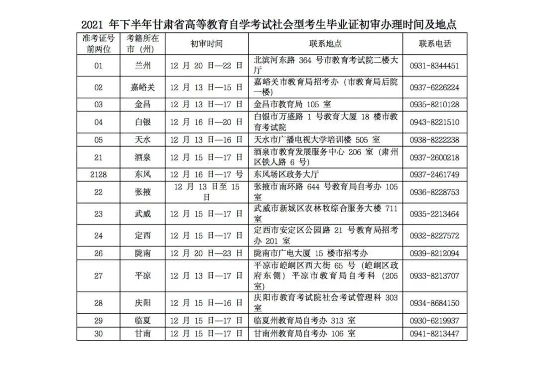 附:2021年下半年甘肅省高等教育自學考試社會型考生畢業(yè)證初審辦理時間及地點