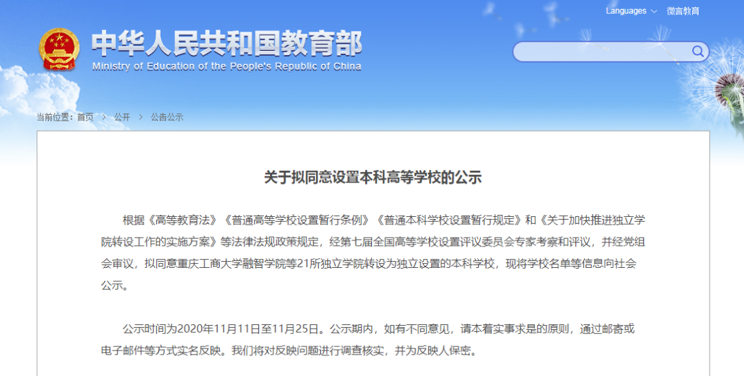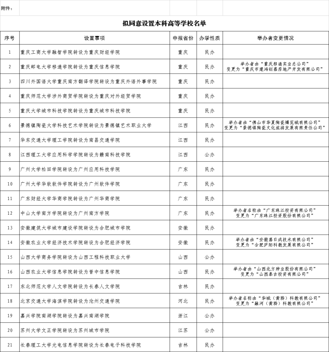 11月11日,教育部發(fā)布《關于擬同意設置本科高等學校的公示》,擬同意重慶工商大學融智學院等21所獨立學院轉設為獨立設置的本科學校,并將學校名單等信息向社會公示。
