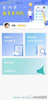 為進(jìn)一步做好參考考生健康情況排查,便于管理,蘭州市教育考試院開發(fā)了小程序“蘭教E考通”,請(qǐng)參加蘭州考區(qū)面試的考生掃描二維碼進(jìn)入,于考前十四天(2021年12月25日-2022年1月7日)進(jìn)行每日健康打卡。流程如下: