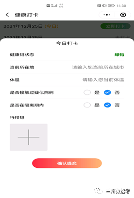 4、按照要求填寫個(gè)人信息,上傳行程卡截圖,確認(rèn)提交,完成健康打卡。(考前十四天連續(xù)每日健康打卡。)