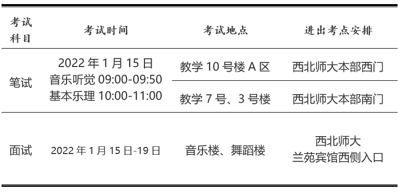 (十一)聲樂檢錄地點(diǎn)在舞蹈樓前,器樂檢錄地點(diǎn)在音樂樓前,考生須嚴(yán)格遵守新冠疫情防控要求,在西北師大蘭苑賓館西側(cè)排隊(duì)進(jìn)出學(xué)校(運(yùn)送大件樂器的車輛由考生憑藝術(shù)體育類專業(yè)考試準(zhǔn)考證從西北師范大學(xué)北門進(jìn)入,考試結(jié)束從東門駛出,所有人員均須檢測體溫并出示健康碼)。