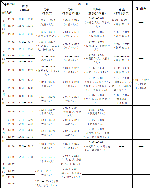 (十)主科考試時間及次序均由計算機(jī)程序隨機(jī)安排,考生應(yīng)嚴(yán)格按照公布的檢錄時間參加檢錄、考試,3次檢錄不到者按自動放棄處理,無論何種原因,一律不再安排補(bǔ)考;考生檢錄后不得以任何理由要求緩考或變更面試次序。除鋼琴外,其它樂器由考生自備。
