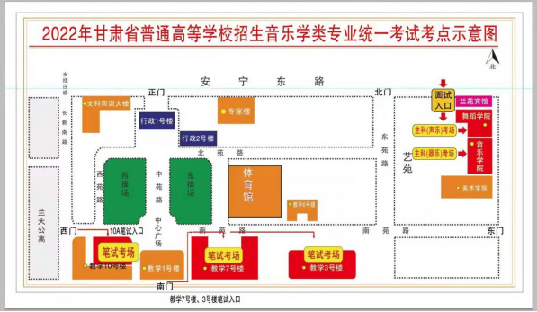 為做好新冠疫情防控工作,確??忌樌雸觯忌毎凑找?guī)定的出入口及路線出入相應(yīng)考點(diǎn)??忌鷳?yīng)提前在考點(diǎn)門口排隊(duì),預(yù)留足夠時間配合考點(diǎn)工作人員進(jìn)行入場核驗(yàn)。具體路線見《2022年甘肅省普通高校招生音樂學(xué)類專業(yè)統(tǒng)一考試考點(diǎn)示意圖》。