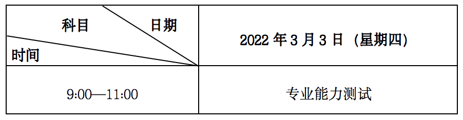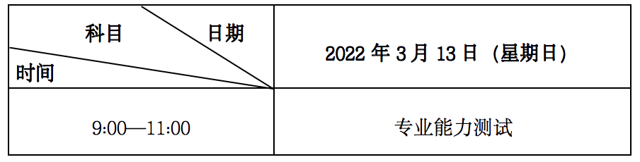 首輪全省統(tǒng)一專業(yè)能力測試時間為2022年3月3日,地點由各招生學(xué)校自主確定并通知參加本校專業(yè)能力測試的考生。具體測試時間與測試科目安排如下(北京時間):