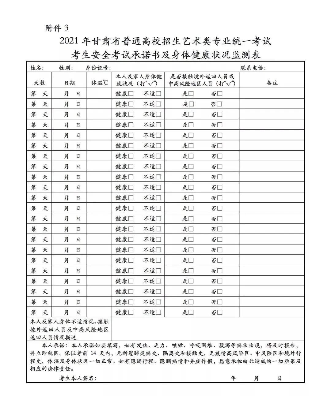 1.考生自考前14天開始至考試結束,在校考生每天由學校負責監(jiān)測、記錄健康狀況,社會考生由所在縣(區(qū))考試招生機構監(jiān)測、記錄健康狀況??荚嚽皟商?,由各縣(區(qū))考試招生機構負責收集匯總考生健康狀況監(jiān)測、記錄數(shù)據(jù)??荚嚻陂g,健康狀況異常考生信息按以上渠道每天上報。所有考生由考點負責,簽訂《2021年甘肅省普通高校招生藝術類專業(yè)統(tǒng)一考試考生安全考試承諾書及身體健康狀況監(jiān)測表》。