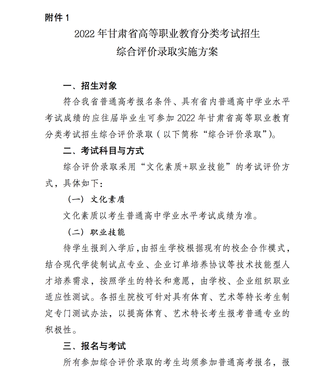 1.2022年甘肅省高等職業(yè)教育分類考試招生綜合評(píng)價(jià)錄取實(shí)施方案