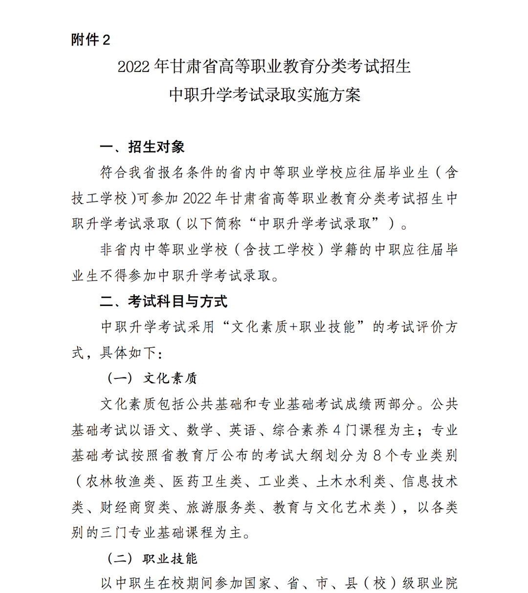 2.2022年甘肅省高等職業(yè)教育分類考試招生中職升學(xué)考試錄取實(shí)施方案